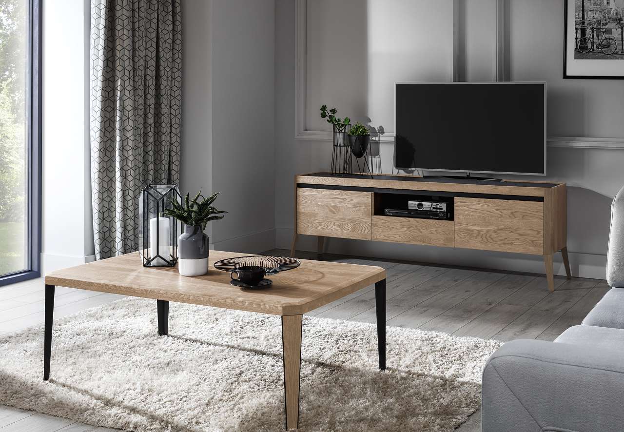 Szafka RTV Rabel- wykonana w całości z drewna dębowego olejowanego. Fronty szafki są w kolorze szarym. Komoda doskonale pasuje do stonowanych kolorystycznie pomieszczeń oraz tam gdzie nie można pozwolić sobie na stolik RTV większy niż 150 cm szerokości.